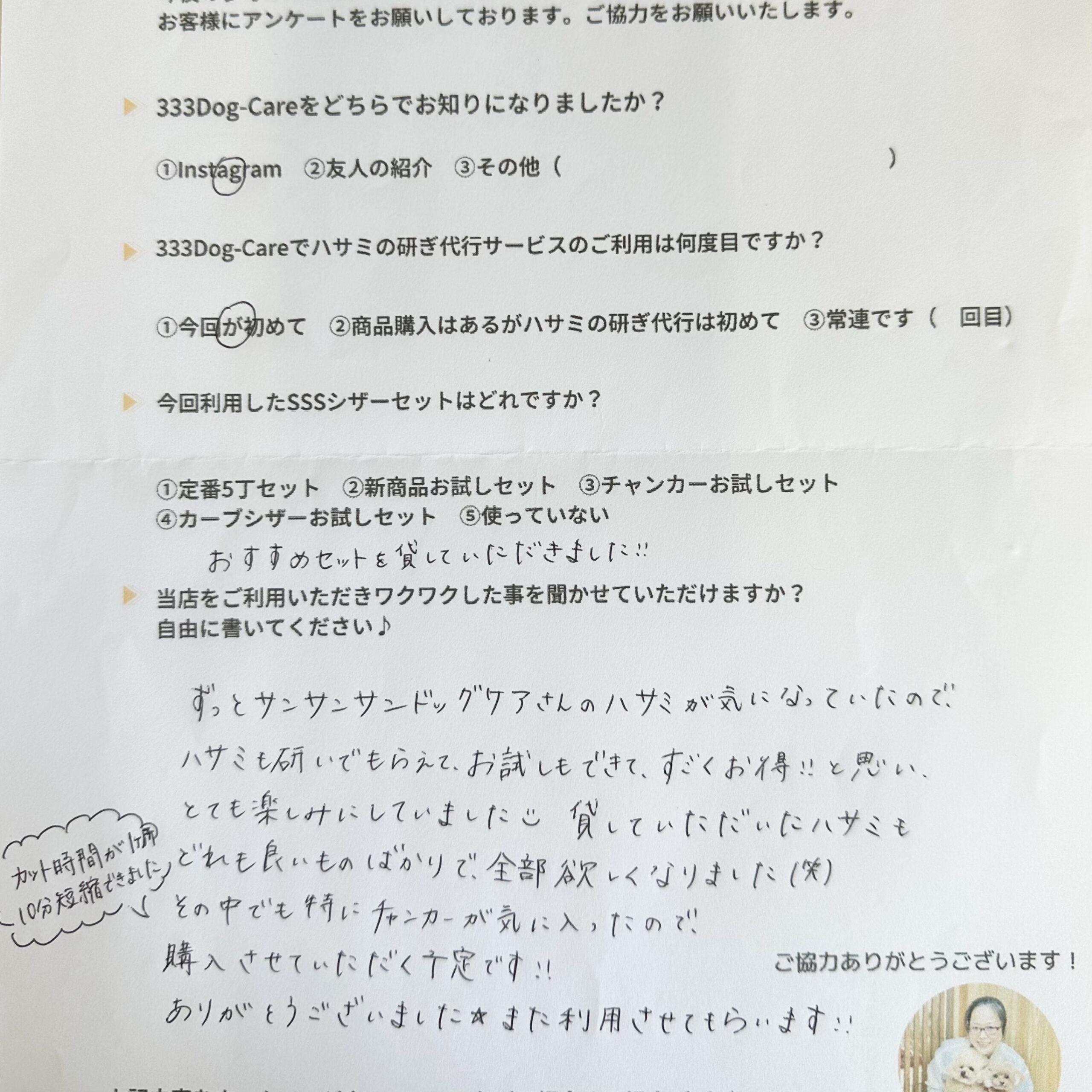 img_3644.jpg Published 2023年8月31日 at 2560 × 2560 in ハサミの研ぎ代行とSSSシザーセットを ご利用いただいたお客様の声【第十二回】 333 Dog-Care トリミングの道具店をもっと見る購読すると最新の投稿がメールで送信されます。 メールアドレスを入力... 購読 ← PreviousNext →