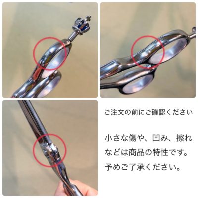 | 注意事項 | ※使用後はシザー用オイルで汚れを落としてください。 ※材質と製造工程における性質上、凹みや擦れ、傷などがある場合がございます。使用上問題のないものにおきましては不良品対象外とさせていただきます。 |